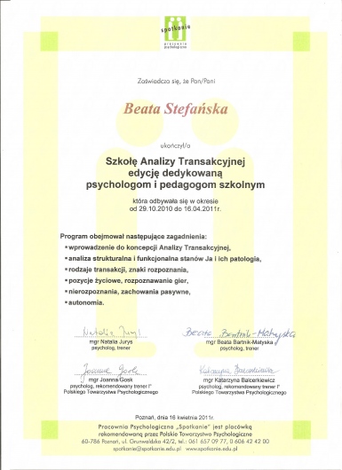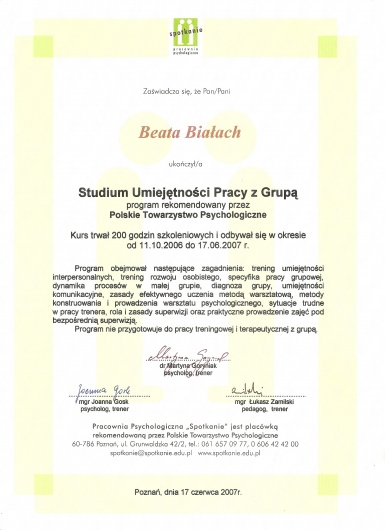 Nie jest łatwo rozmawiać o swoich problemach, emocjach, o rzeczach które nas martwią. Jako dorośli nie potrafimy ze sobą rozmawiać więc oczekiwanie, że nasze dzieci przyjdą do nas ze swoimi problemami jest wręcz naiwne. Jako rodzice często nie zdajemy sobie sprawy z powagi sytuacji. W naszym przypadku Pani Beata była na początku pośrednikiem w poznawaniu problemów naszych i dziecka, w ich wzajemnym zrozumieniu. Poznaliśmy metody wzajemnego docierania do siebie, poznawania od nowa osób które wydawało się że znamy wiele lat. Dziś emocje, choć ważne, nie są przeszkodą w rozmowach o problemach. Dziecko w indywidualnych spotkaniach pokonało przeciwności, udało się zażegnać kryzys i z poziomu samookaleczenia przeszliśmy do wspólnego dialogu. Jako rodzina odzyskaliśmy siebie na wzajem. I na tym chyba zakończę rekomendację.