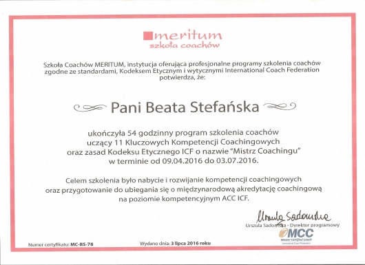Profesjonalnie poprowadzona sesja, zaangażowanie, umiejętnie zadawane pytania, doświadczenie, wiedza i kompetencje, które Beata posiada sprawiły, że odpowiedziałam sobie na wszystkie nurtujące pytania. Poznałam swoje mocne strony, zidentyfikowałam swoje zasoby i potencjał. Dzięki temu wyznaczyłam kierunek, w którym chcę zmierzać, zaplanowałam działania, by osiągnąć zamierzone cele.